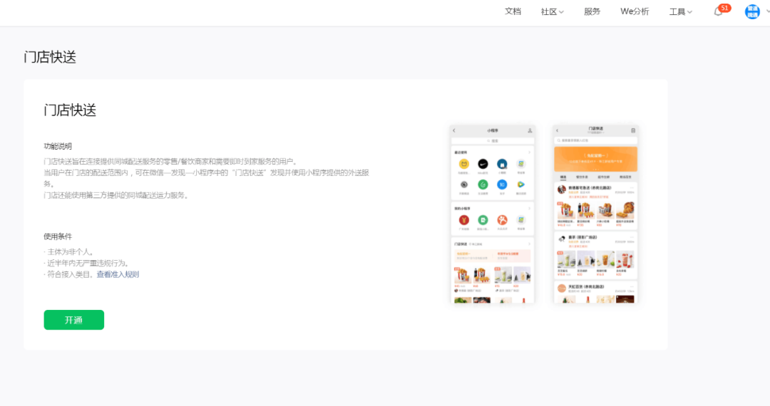 微信小程序后臺新增功能:“門店快送”,主要針對的是餐飲店、蛋糕店、鮮花店、奶茶店、超市零售店等。