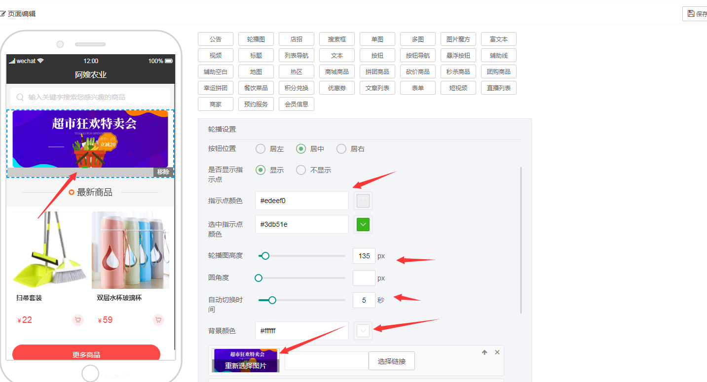比如需要更換輪播圖,鼠標點中它,左邊的上傳圖片 就可以傳新的圖片,同時可以設置連接,和大小,樣式