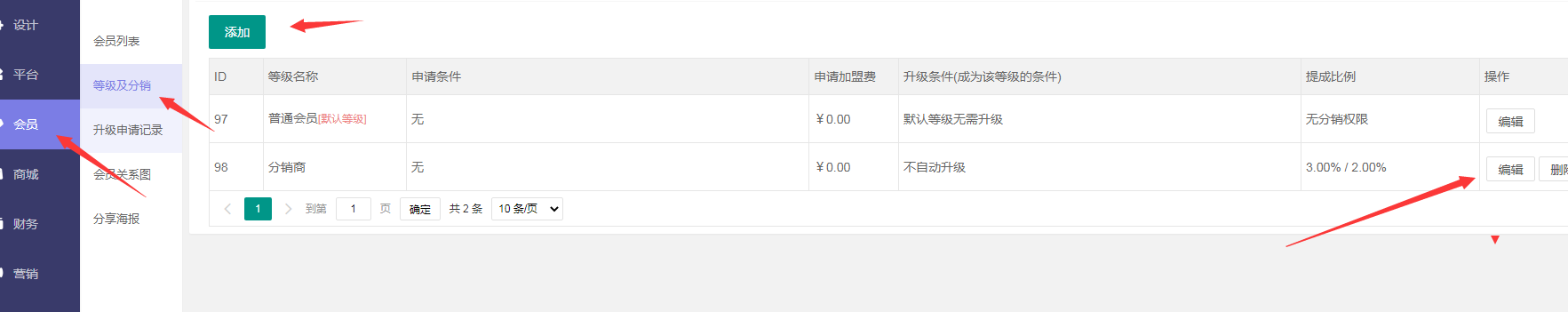 然后是會員管理,和等級分銷,可以直接編輯默認的分銷設置,也可以添加更多的會員等級,進行升級的條件設置。