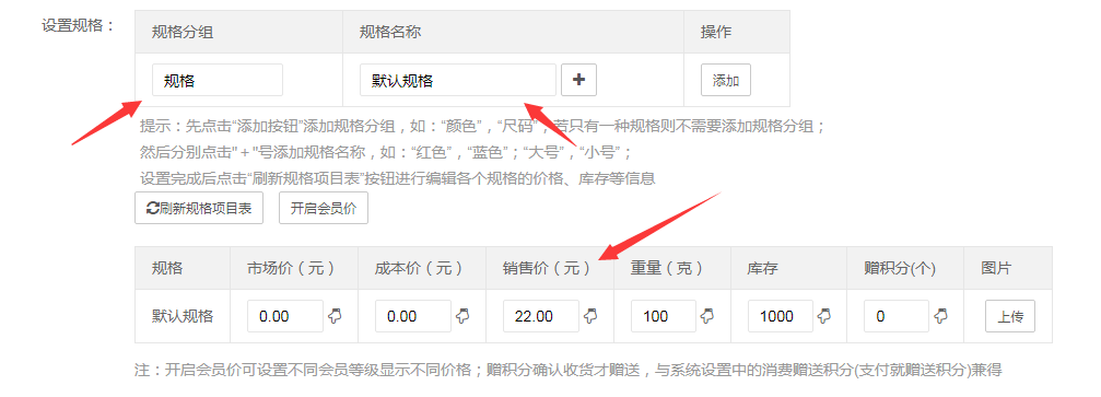 規格根據自己需要設置,名字和規格參數,也可以不設置,直接下面銷售價填寫價格