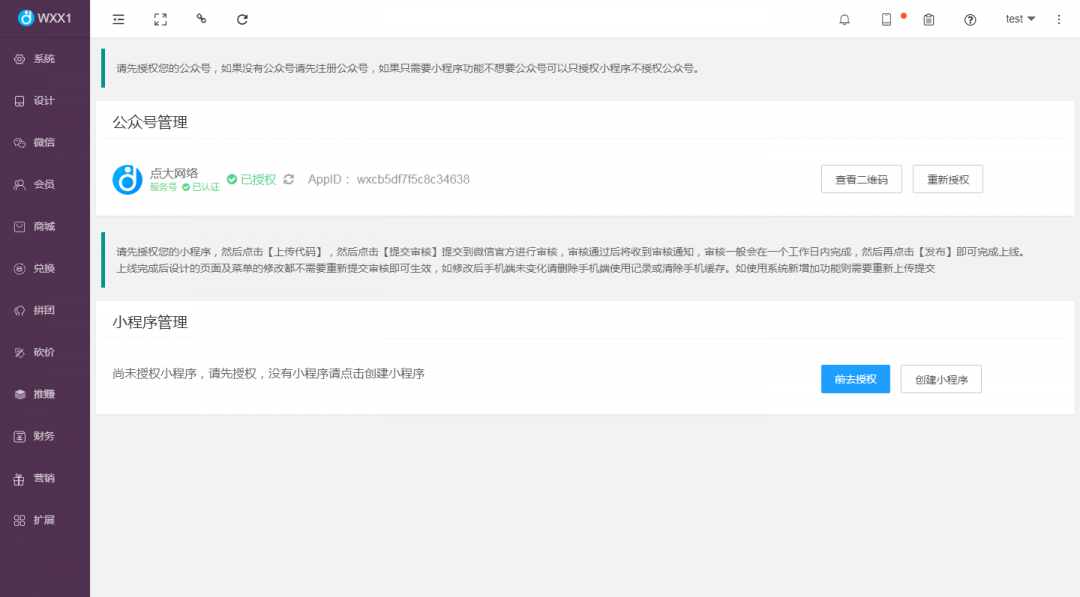 第三步:點擊授權,即可授權完成,電腦端顯示授權的公眾號信息,授權完成后就可以在【微信】-【公眾號管理】及【公眾號設置中】管理您的微信公眾號了
