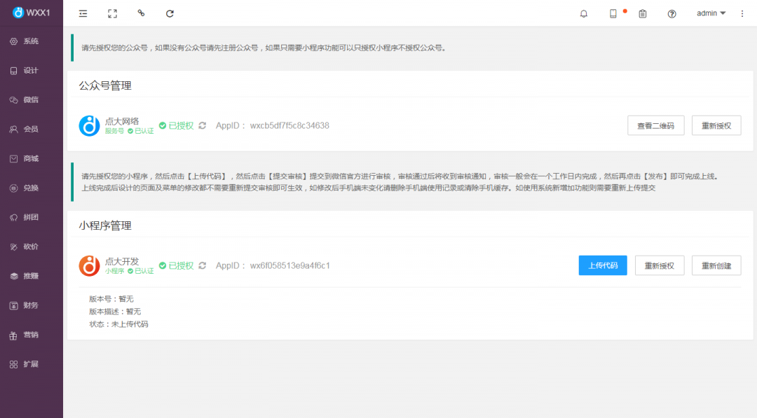 小程序內(nèi)容填充完成之后,在【微信】-【授權(quán)管理】進(jìn)行上傳代碼提交審核發(fā)布