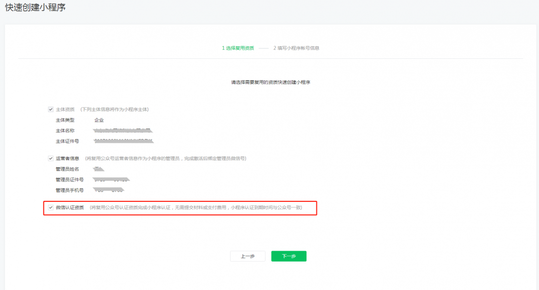 4、勾需要選快速創(chuàng)建小程序的資質(zhì)
