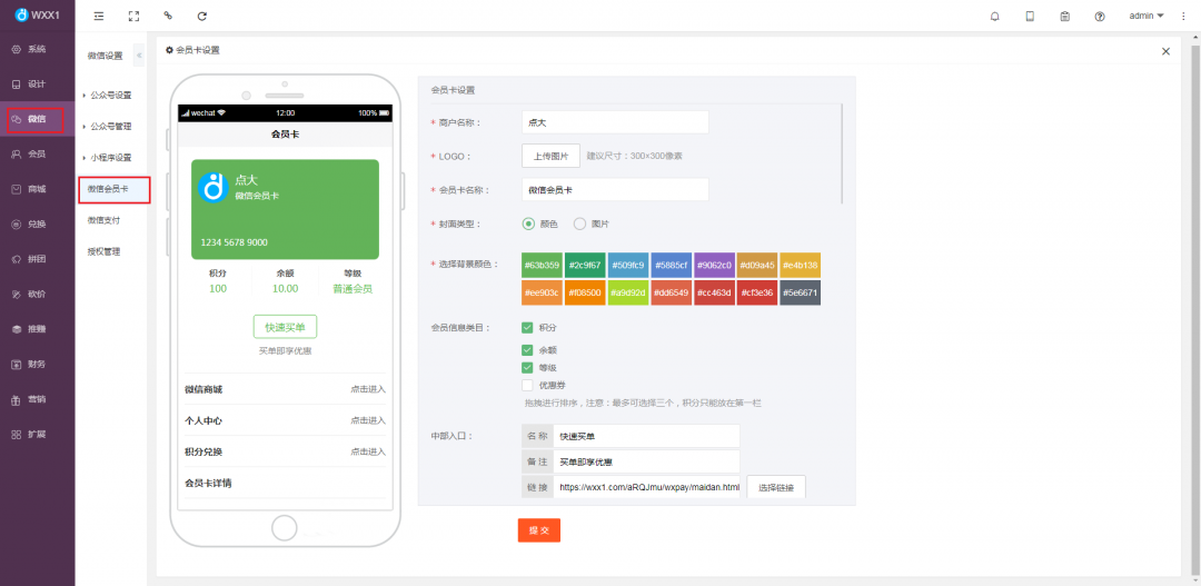 8、在管理后臺(tái)(wxx1.com)管理后臺(tái)【微信】-【微信會(huì)員卡】點(diǎn)擊創(chuàng)建會(huì)員卡,填寫(xiě)設(shè)置信息后點(diǎn)擊提交即可創(chuàng)建完成