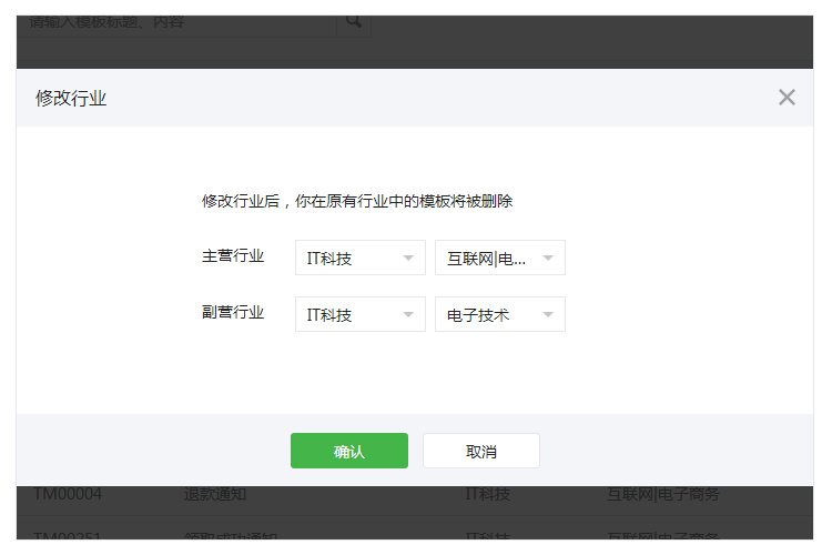 2、選擇公眾賬號(hào)服務(wù)所處的兩個(gè)行業(yè),每月可更改一次所選行業(yè)